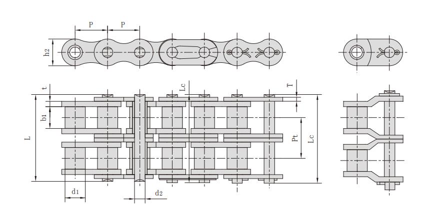 鏈號 節距 滾子直徑 內節內寬 銷軸直徑 銷軸長度 內鏈板高度 鏈板厚度 排距 抗拉強度 平均抗拉強度 每米長重